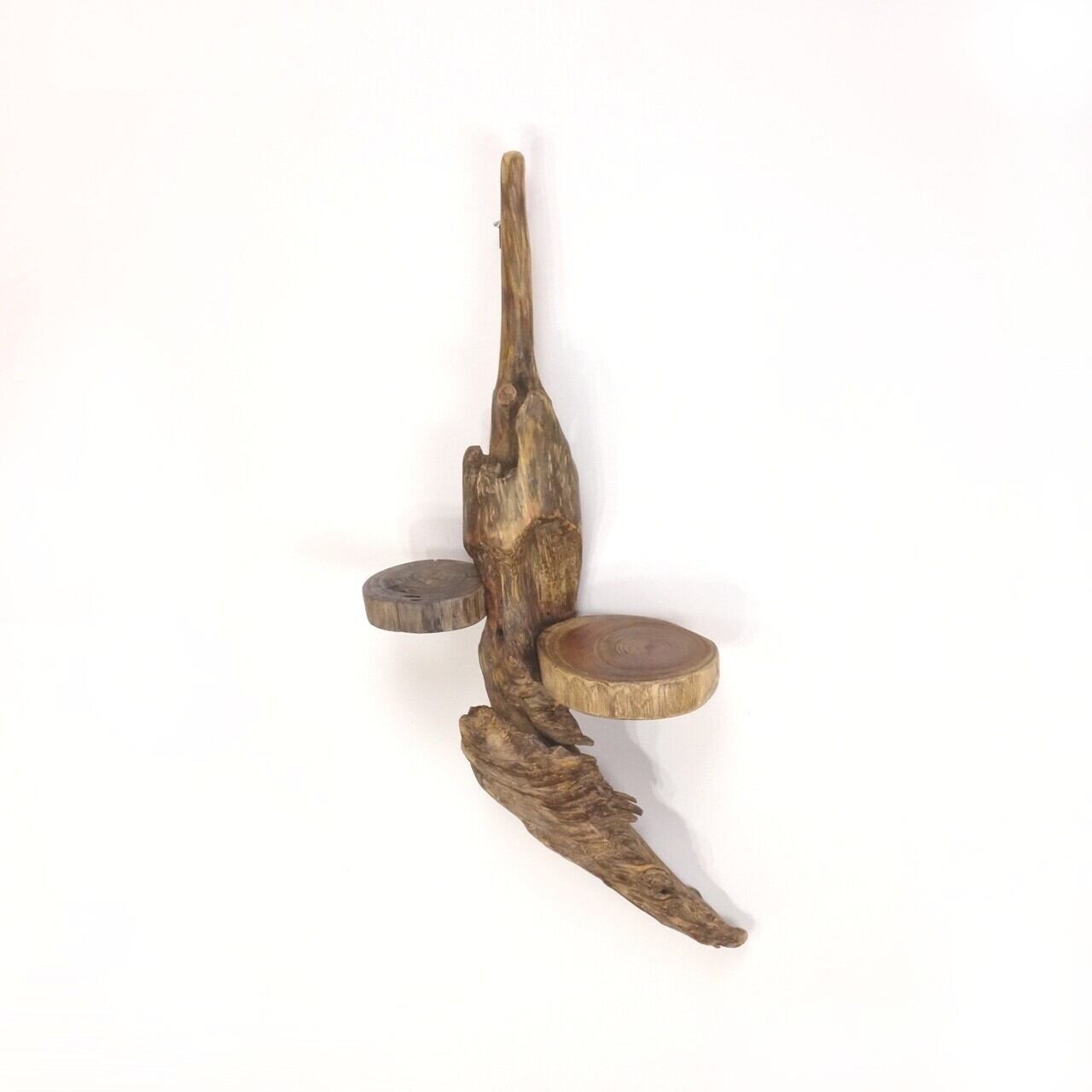 軸となる個性的な流木に 丸太流木を取り付けた、壁掛け飾り棚です。