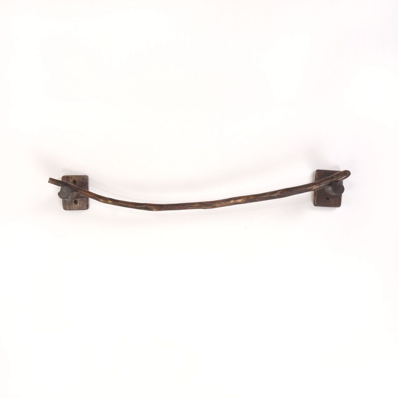 タオルを掛けるハンガー部は キレイな弧を描く湾曲細枝流木、たくさんの枝跡が見られます。