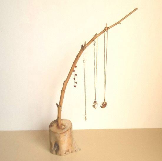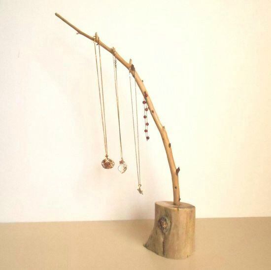 年輪が美しい丸太の土台に枝流木を取り付けると、アクセサリーや鍵などの小物を掛けることができるジュエリー スタンドとなりました。