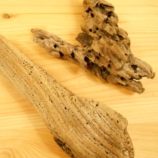 海で採集した、穴がたくさんあいている流木の4点セットです。