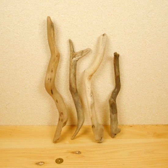 海で採集した棒系の流木の4点セットです。どの流木も軽く、くねくね曲がっています。