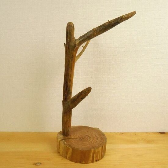 流木丸太輪切りの台座にしっかり太い枝を挿しこんだアクセサリースタンドです。