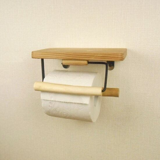 ナチュラルな木製棚のトイレットペーパーホルダー、押さえ付きです。