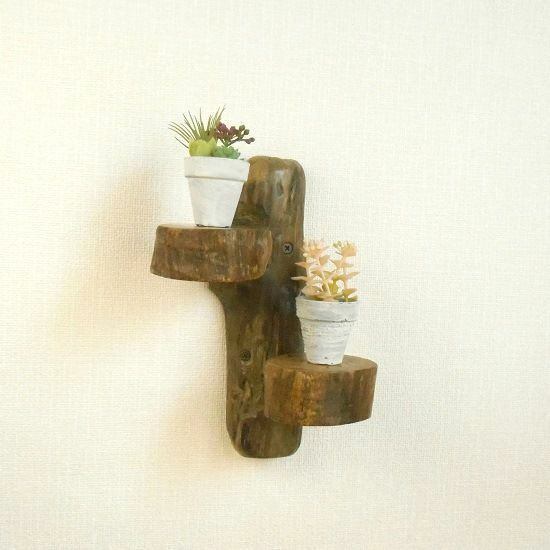 【温泉流木】水墨画のような幹の流木にかわいい2つ丸太の花台ラック 壁掛け棚 ウォールラック 流木インテリア