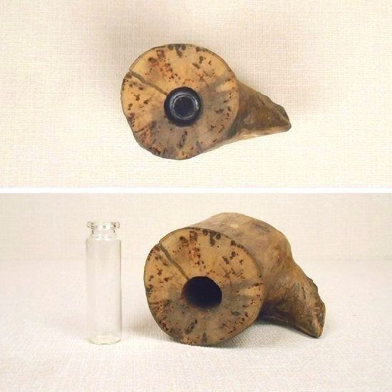中央に穴を彫り、内径1.2cm、高さ7.5cm のガラス瓶を挿入しています。