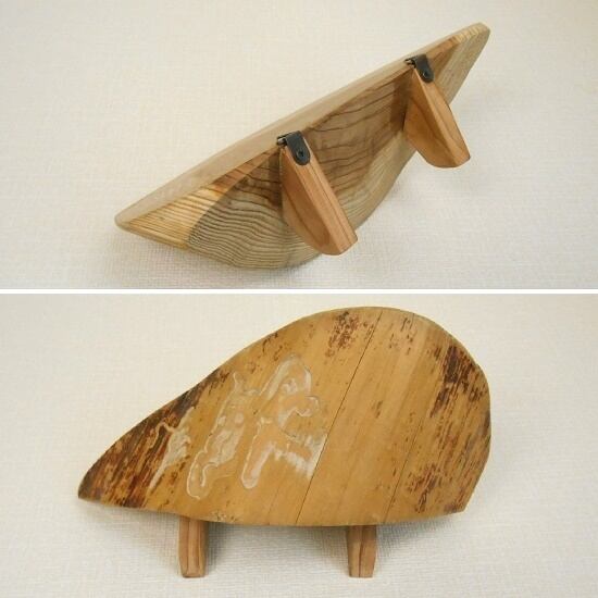 丸太に支えとなる流木の足を付け、裏側にブロンズ色の吊り金具を取り付け、吊り式の飾り台となりました。
