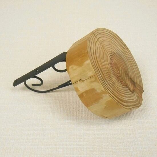 丸太裏におしゃれなダークブラウンのL字金具を付け、壁掛け棚、飾り台として仕上げました。