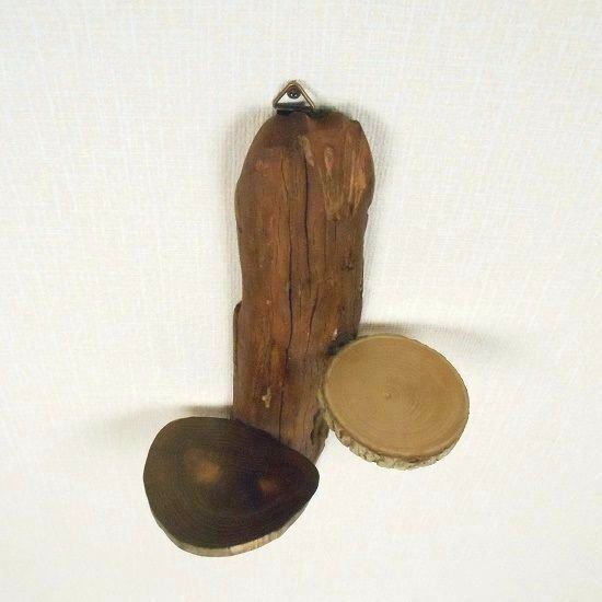 丸い輪切りの棚板となる木材は色が違い、上はエンジュの木で径8〜10cm、下はイチョウの木で径7.5cmとなります。