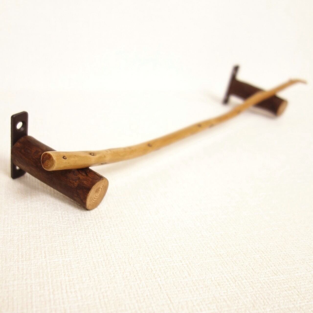 天然保護塗料である 柿渋 を塗布したミニ丸太流木を両サイドに、細枝流木を上に乗せたシンプルなタオル掛けです。