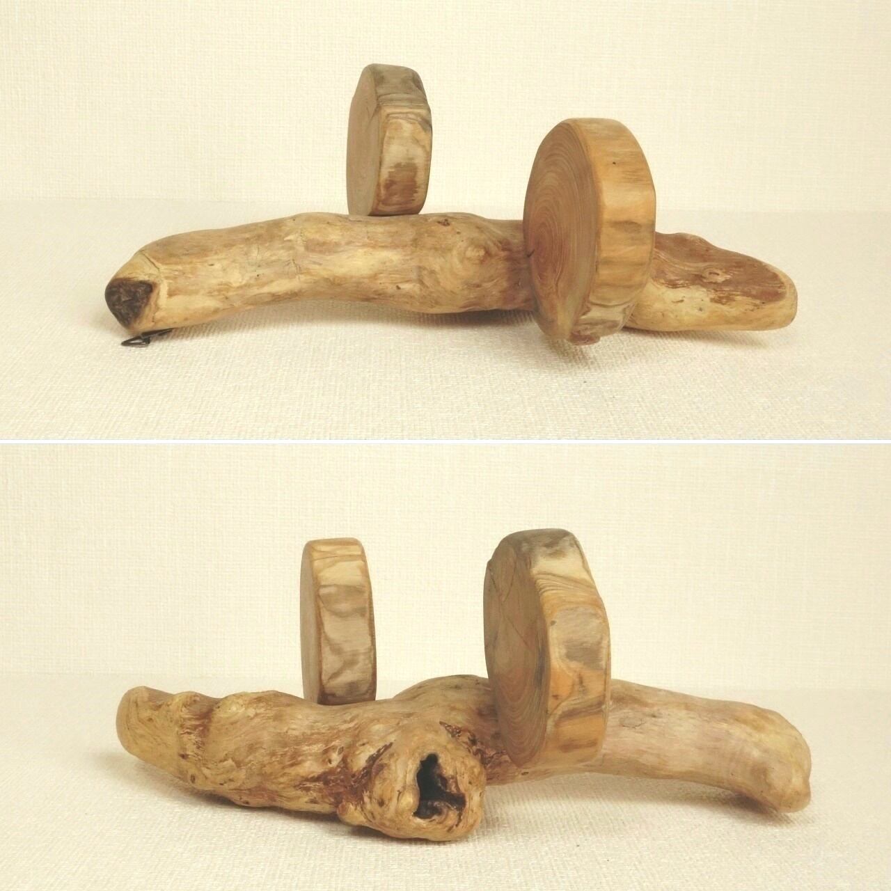 おもむきのある流木とかわいい丸太流木とを組み合わせた、壁掛けの飾り棚です。