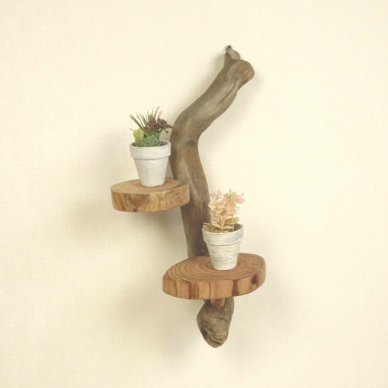 おもむきのある流木とかわいい丸太流木とを組み合わせた、壁掛けの飾り棚です。