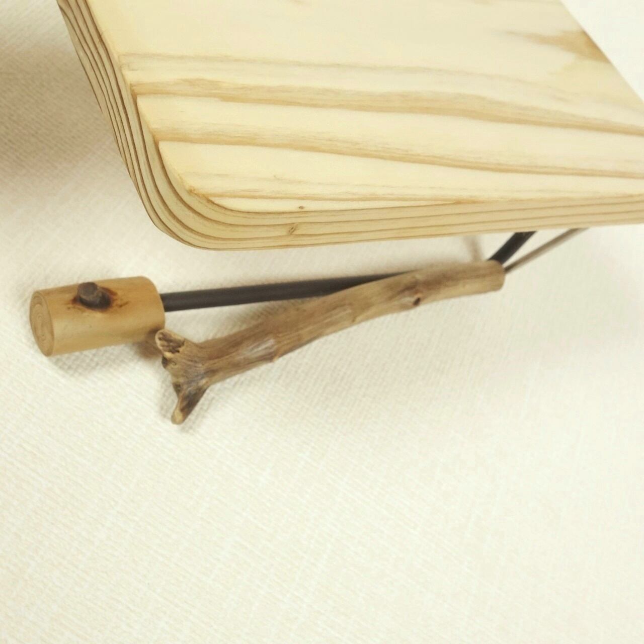 ホルダーのバーの先は枝分かれ流木、押さえは、少し変形しうねりのある枝分かれで、木の皮の色素の色が入った流木です。