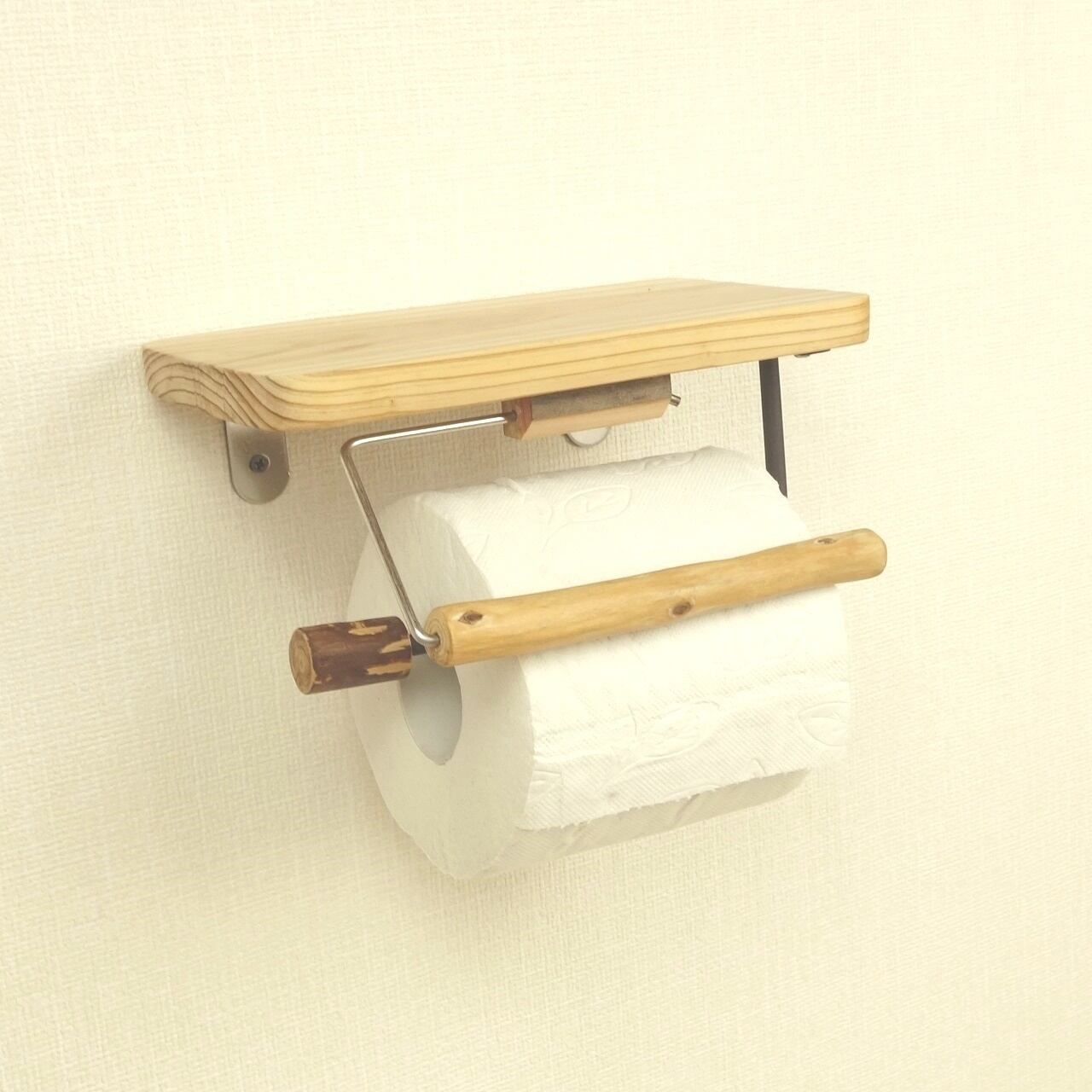 ナチュラルな木製棚のトイレットペーパーホルダー、棚板は流木でなく製材を使用、素朴な明るい木の色です。