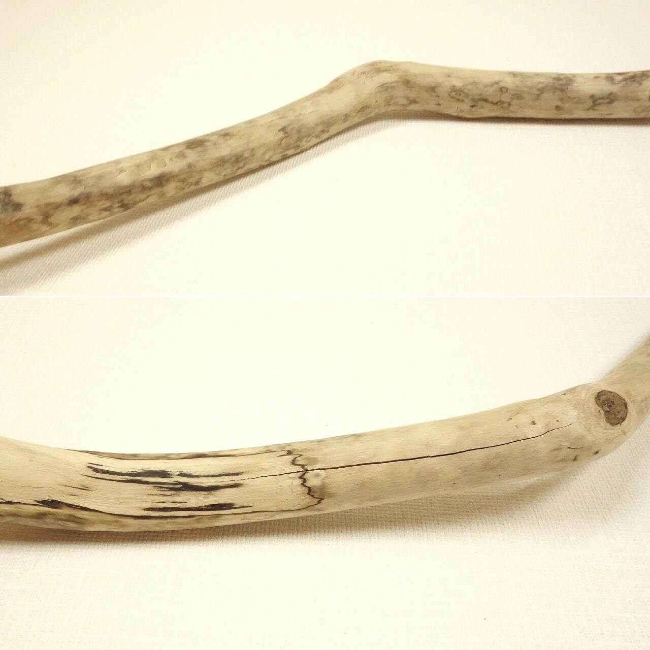枝跡の木の節から「く」の字に曲がる枝の流木、すべすべの手触りです。