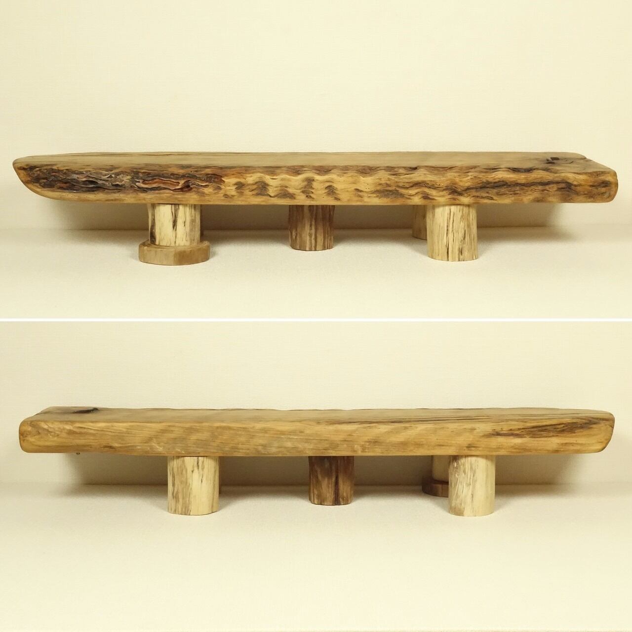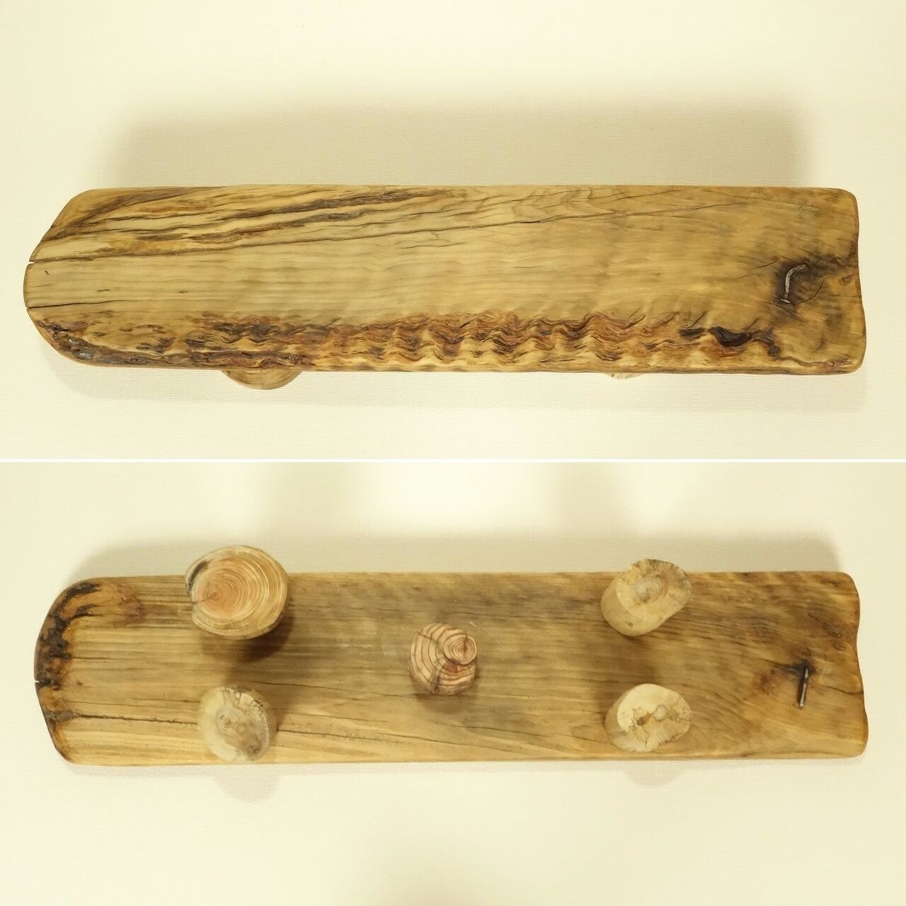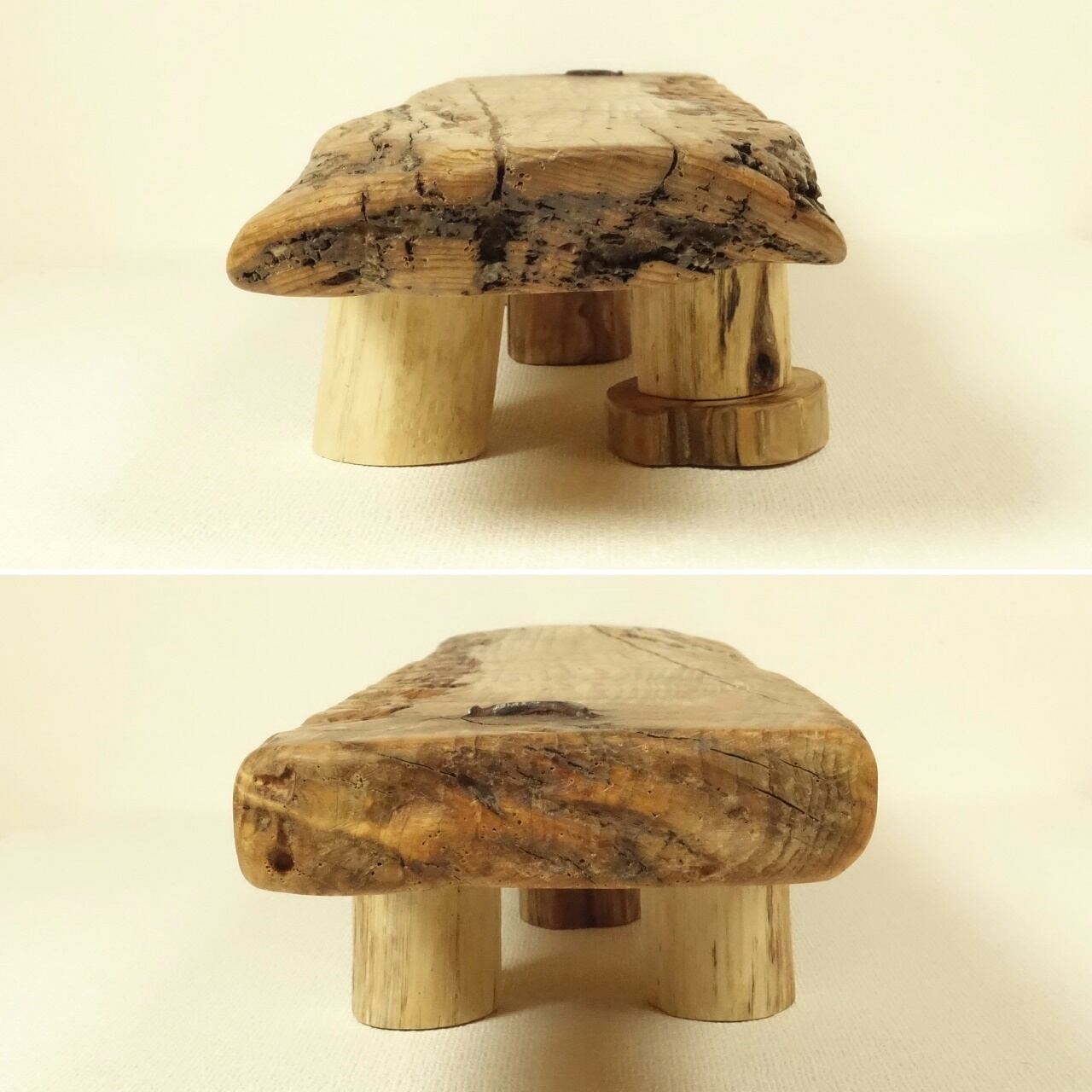 5本の丸太足を取り付けて安定を出し、その中で前足の1本は径の少し大きい輪切りの丸太台に乗っています。
