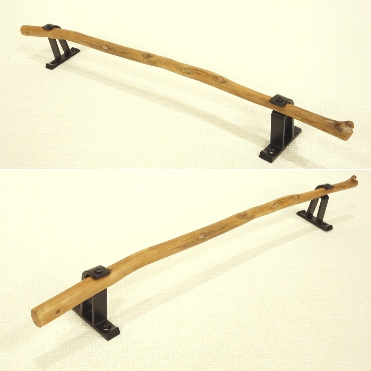 画像ではハンドタオルを掛けております。タオルを掛ける部分の幅は約 27.5cm、流木中央部の径は 1.2cm ほどです。