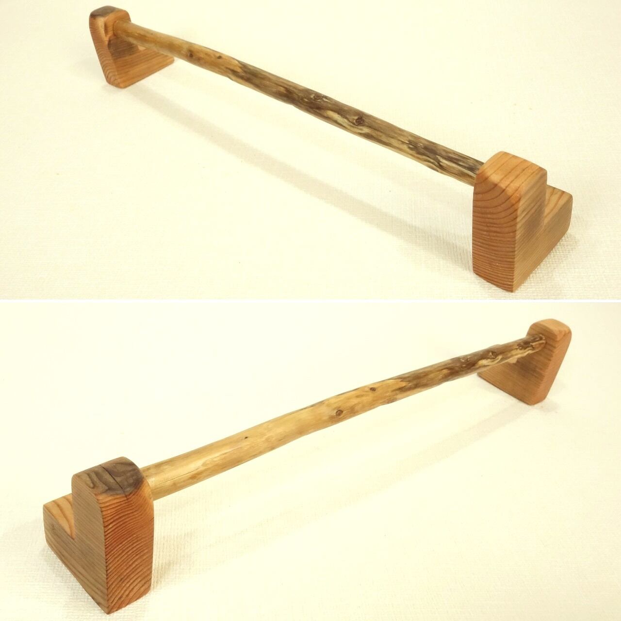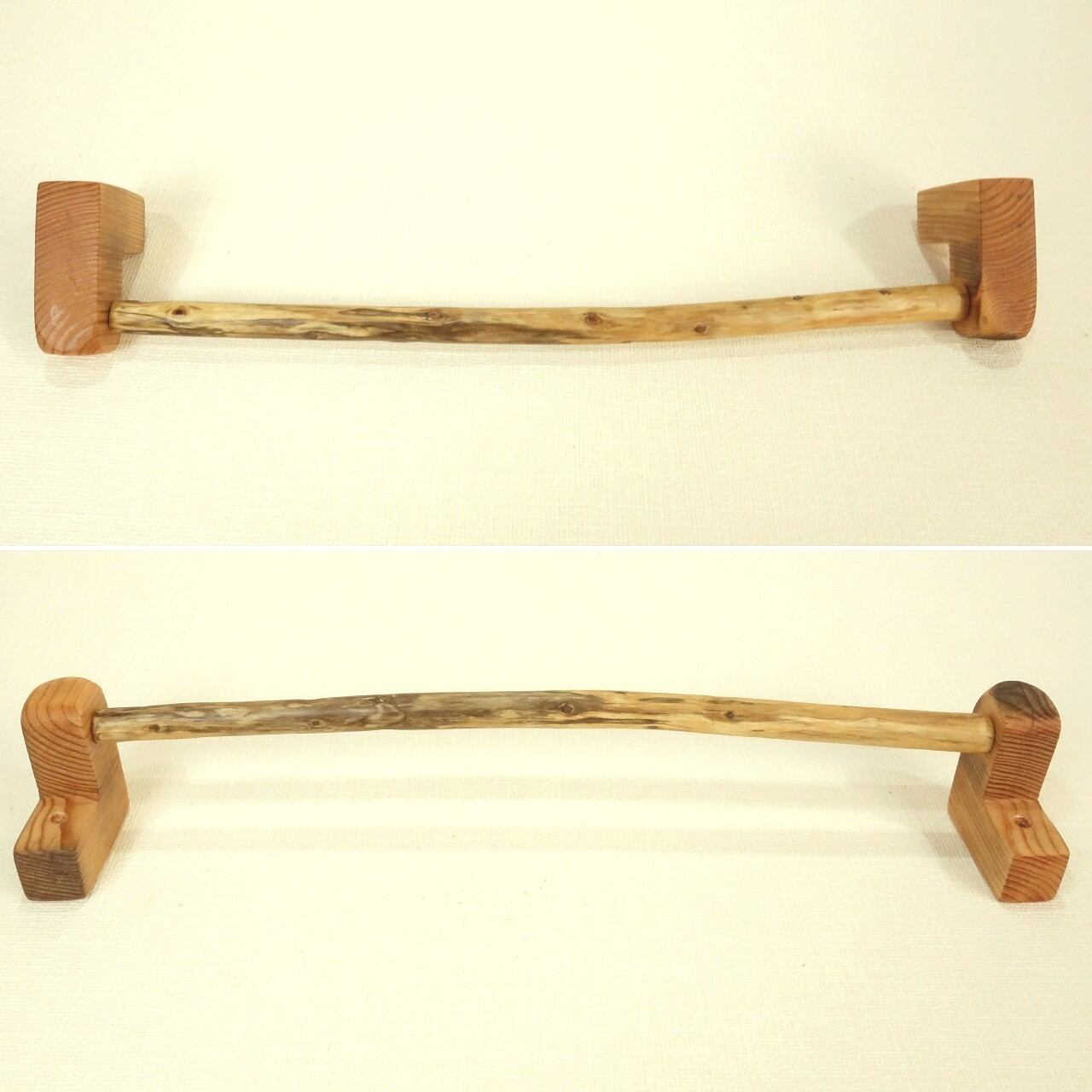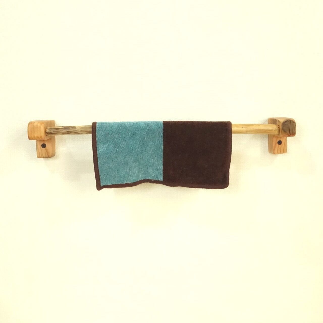 画像ではハンドタオルを掛けております。タオルを掛ける部分の幅は約 40cmほど、枝流木中央部の径は 1.6cm ほどです。