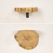 丸太は 厚み 2.2cm、径は 11〜12cm ほどの 幅が長い変形円、棚上は平らです。