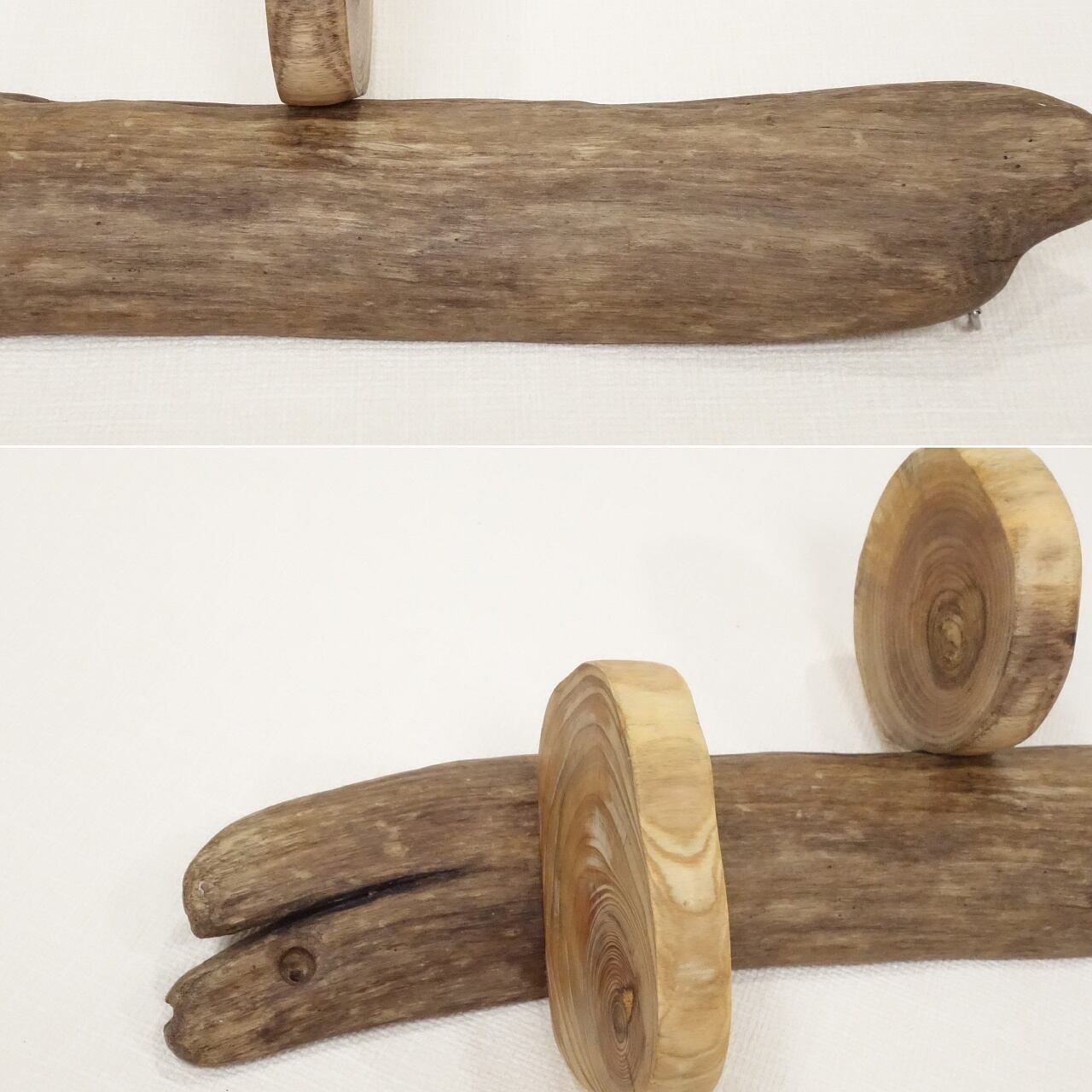 丸太流木は 上が 径 9cm、下は角丸四角となっており 10×7.5cm ほど、違う種類の丸太の組み合わせ、ともに年輪が見られます。