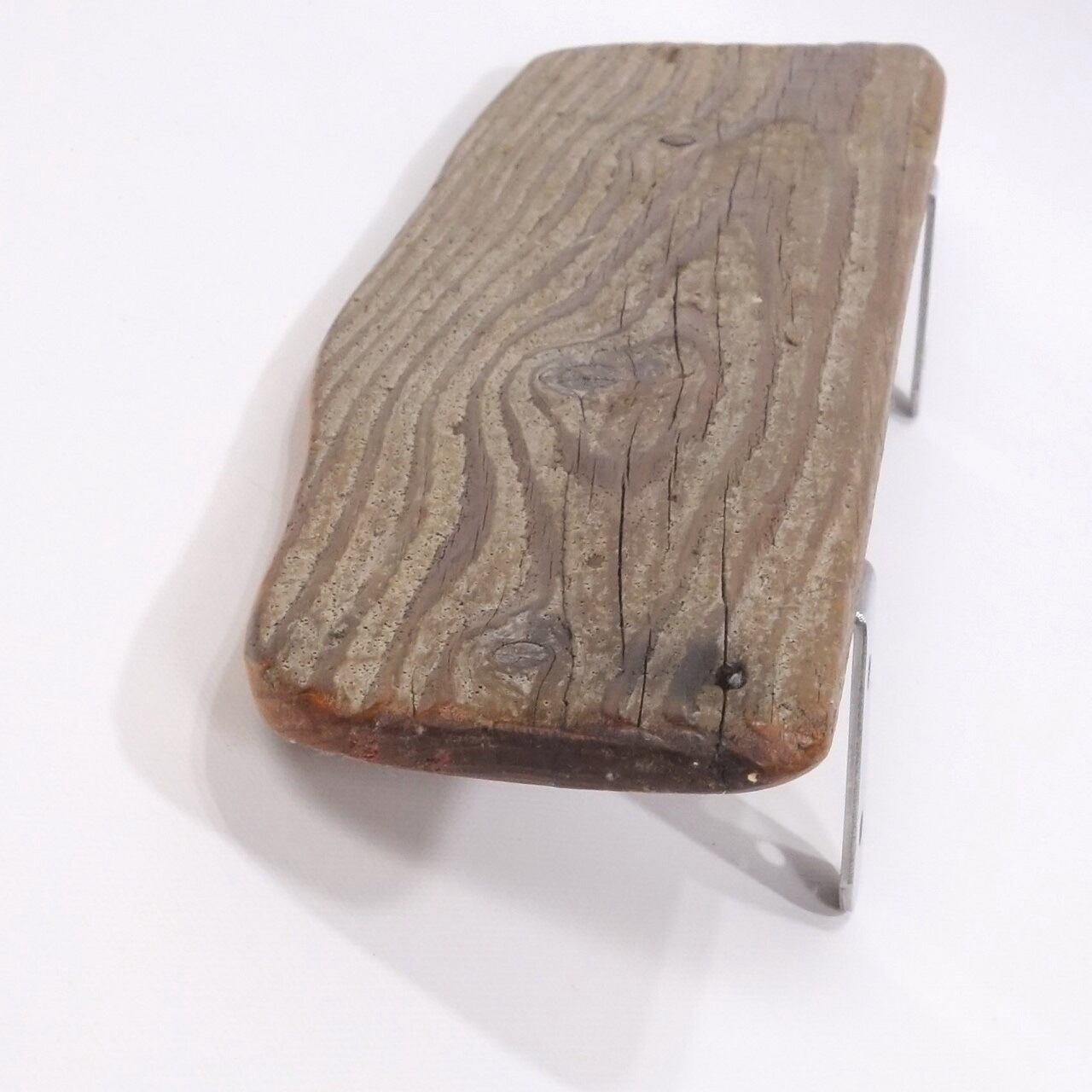 海で採集した板流木は、木目が波打つように彫刻され、その削れている部分には虫食い跡や細かいキズなどで 白っぽく見えます。